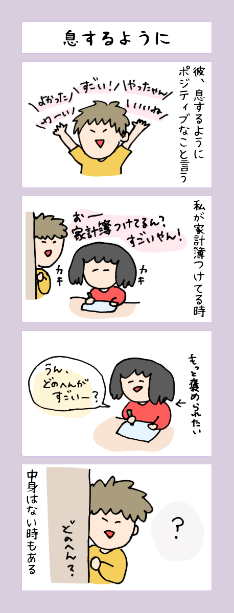 【4コマ漫画】息するように 京都4コマ漫画 Twitter Facebook はてブ LINE Pinterest コピー 2026.03.30 スポンサーリンク こんにちは!おきピン!(@okipin_)です。 京都4コマ漫画、本日は「息するようにポジティブなことを言う彼」の話 彼「どのへんとかはない」 ISFPは気持ちの言語化が苦手って言うので、それも関係しているのかもしれない